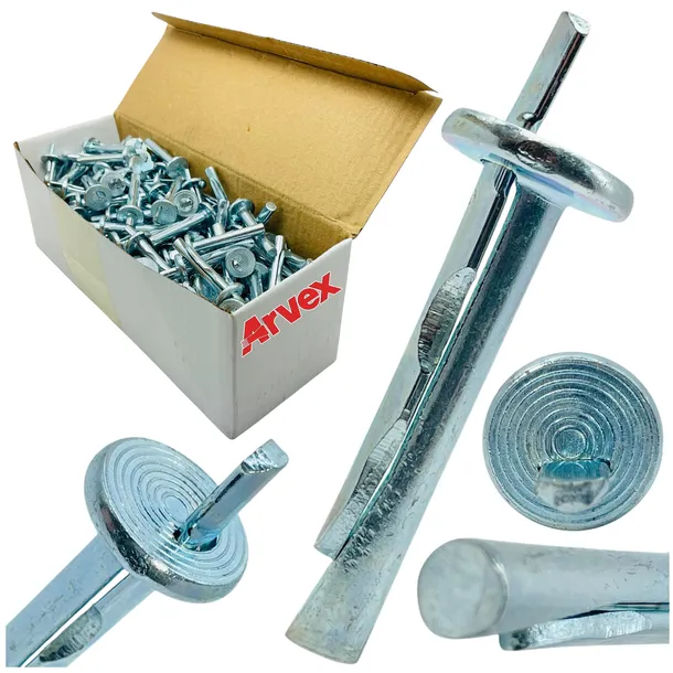 Kotwa metalowa wbijana klinowa KDN firmy Arvex to specjalistyczny łącznik mechaniczny przeznaczony do szybkiego i trwałego mocowania elementów w podłożach pełnych, takich jak beton czy cegła pełna. Dzięki swojej konstrukcji oraz właściwościom, kotwa ta znajduje zastosowanie w różnorodnych pracach montażowych, zwłaszcza tam, gdzie wymagana jest niepalność oraz szybki montaż.