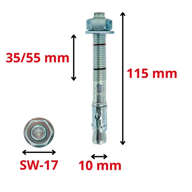 Kotwa mechaniczna LE-ZN składa się z nagwintowanego trzpienia zakończonego stożkiem rozpierającym, opaski rozporowej oraz nakrętki sześciokątnej i podkładki. Wykonana jest ze stali niskowęglowej i pokryta warstwą ocynku, co zapewnia ochronę antykorozyjną. Zamocowanie następuje poprzez dokręcenie nakrętki odpowiednim momentem, co powoduje przesunięcie opaski rozporowej i powstanie trwałego zakotwienia w podłożu. Kotwa jest idealna do montażu wewnątrz budynku: maszyn i urządzeń, mocowań seryjnych (barierki, poręcze, regały magazynowe), montażu lekkich i średnich konstrukcji stalowych.
